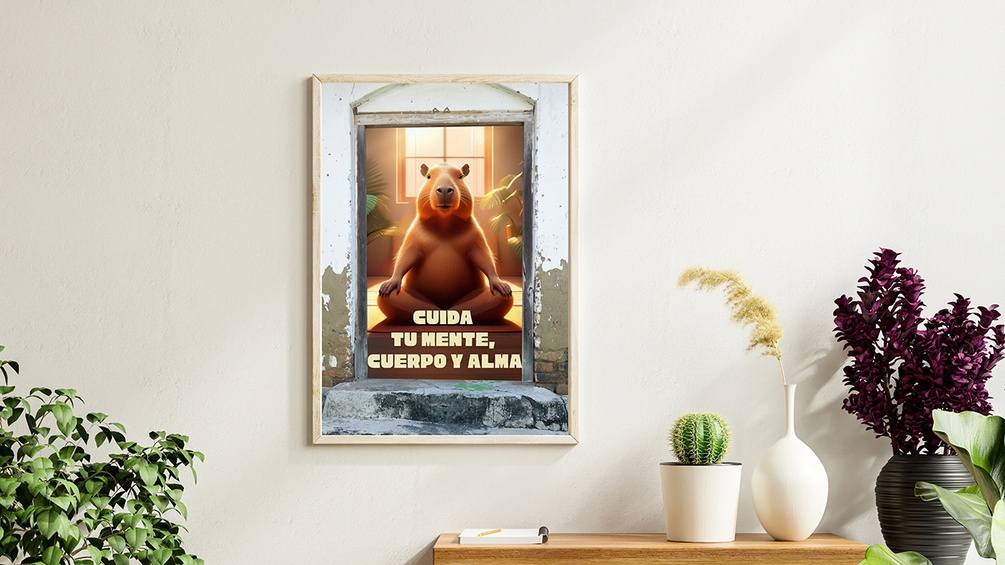 Póster digital “Cuida tu mente, cuerpo y alma” – Capibara en modo zen