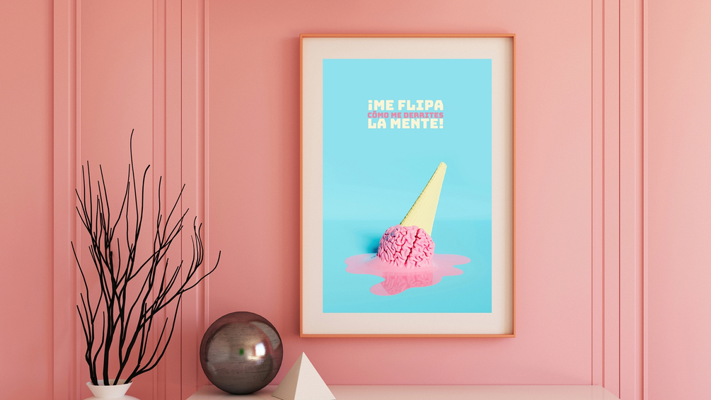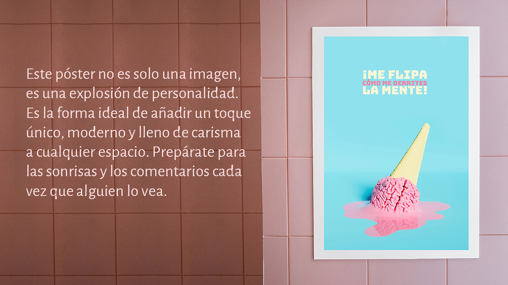 Sumérgete en un mundo de color y humor con el exclusivo diseño: un cerebro rosado, increíblemente cool, que parece derretirse como el helado más sabroso, coronado con un crujiente barquillo. Todo esto, bañado en un vibrante fondo azul cielo que evoca frescura y diversión. La frase destacada, "¡ME FLIPA CÓMO ME DERRITES LA MENTE!", es un grito de admiración y asombro que resuena con un toque de genialidad y picardía.